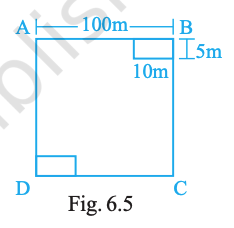 A square shaped park ABCD of side 100 m has two equal rectangular flower beds each of size 10 m × 5 m (Fig. 6.5). Length of the boundary of the remaining park is