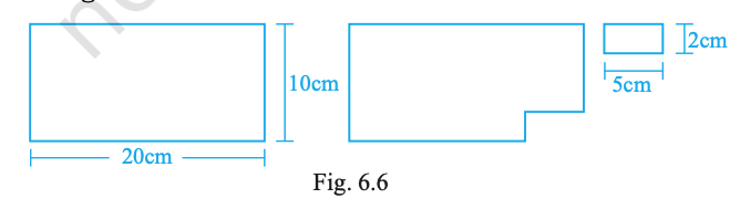 Length and breadth of a rectangular sheet of paper are 20 cm and 10 cm, respectively. A rectangular piece 5 cm × 2 cm is cut from the sheet as shown in Fig. 6.6. Which statement is correct for the remaining sheet?