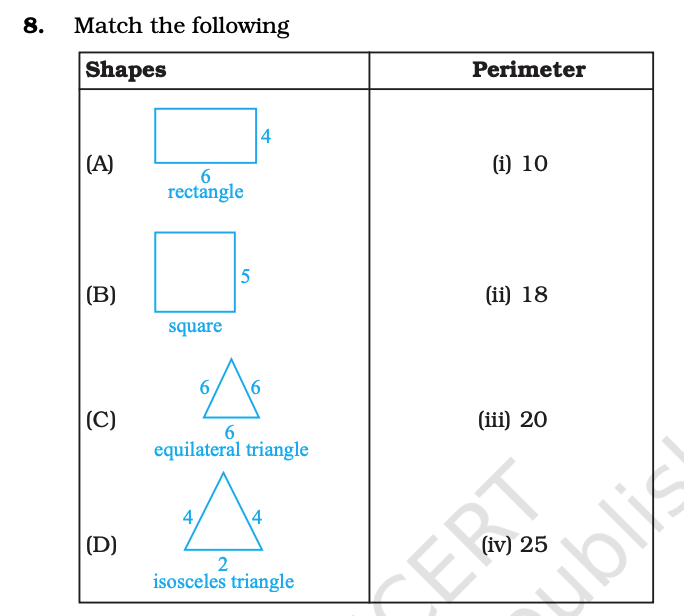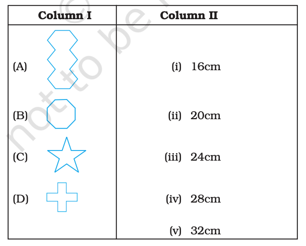 7. Match the shapes (each side measures 2 cm) in Column I with the corresponding perimeters in Column II: