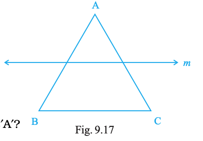 Draw the images of the points A, B and C in the line m (Fig. 9.17). Name them as A′, B′ and C′, respectively and join them in pairs. Measure AB, BC, CA, A′B′, B′C′ and C′A′. Is AB = A′B′, BC = B′C′ and CA = C′A′?
