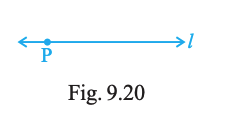 Copy Fig. 9.20 on your notebook and draw a perpendicular to l through P, using (i) set squares (ii) protractor (iii) ruler and compasses. How many such perpendiculars are you able to draw?