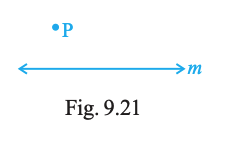 Copy Fig. 9.21 on your notebook and draw a perpendicular from P to line m, using (i) set squares (ii) Protractor (iii) ruler and compasses. How many such perpendiculars are you able to draw?