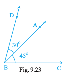 Draw an angle ABC of measure 45°, using ruler and compasses. Now draw an angle DBA of measure 30°, using ruler and compasses as shown in Fig. 9.23. What is the measure of ∠DBC?