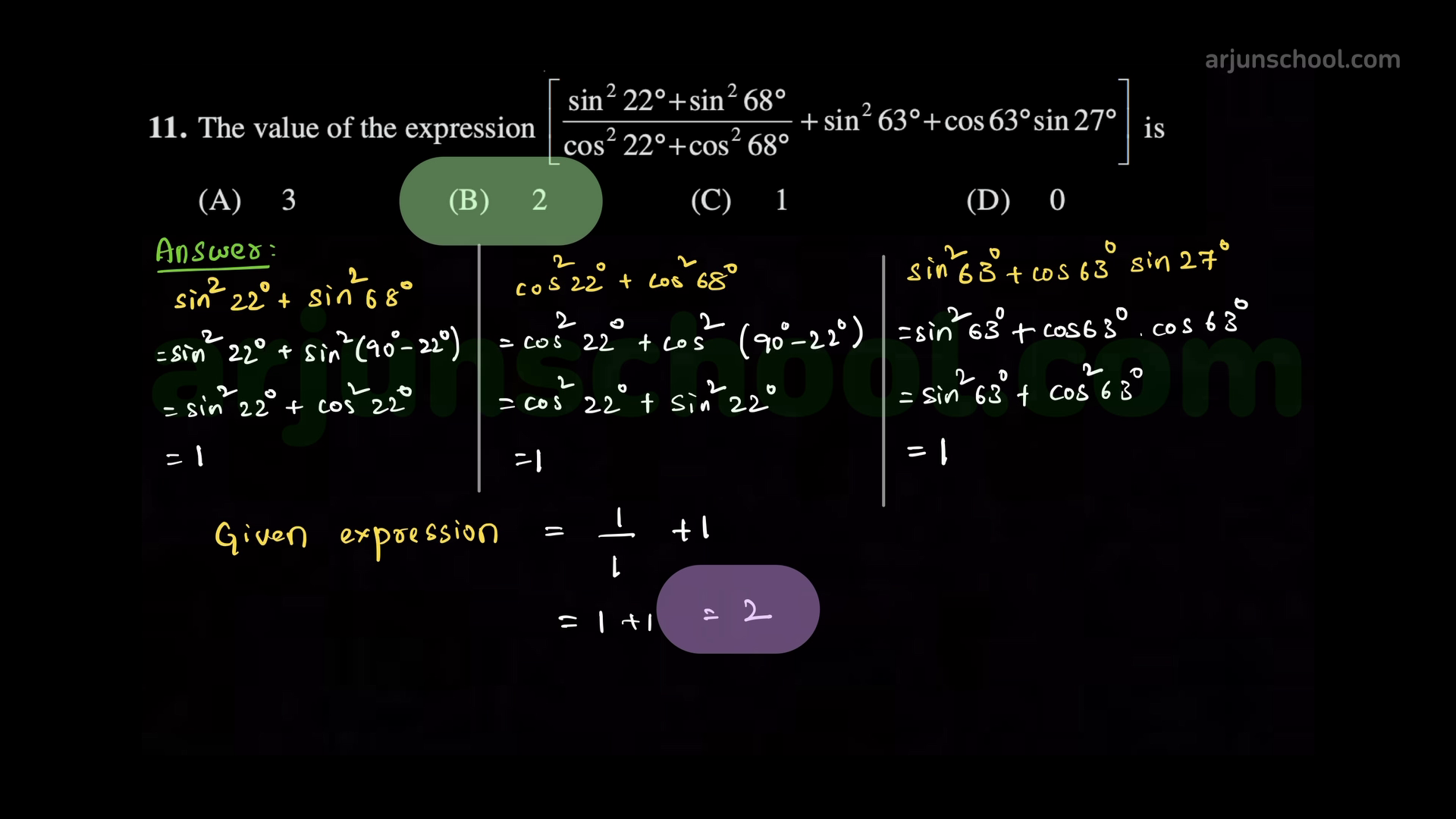 The value of \(\left[\dfrac{\sin^2 22^\circ+\sin^2 68^\circ}{\cos^2 22^\circ+\cos^2 68^\circ}+\sin^2 63^\circ+\cos63^\circ\sin27^\circ\right]\) is