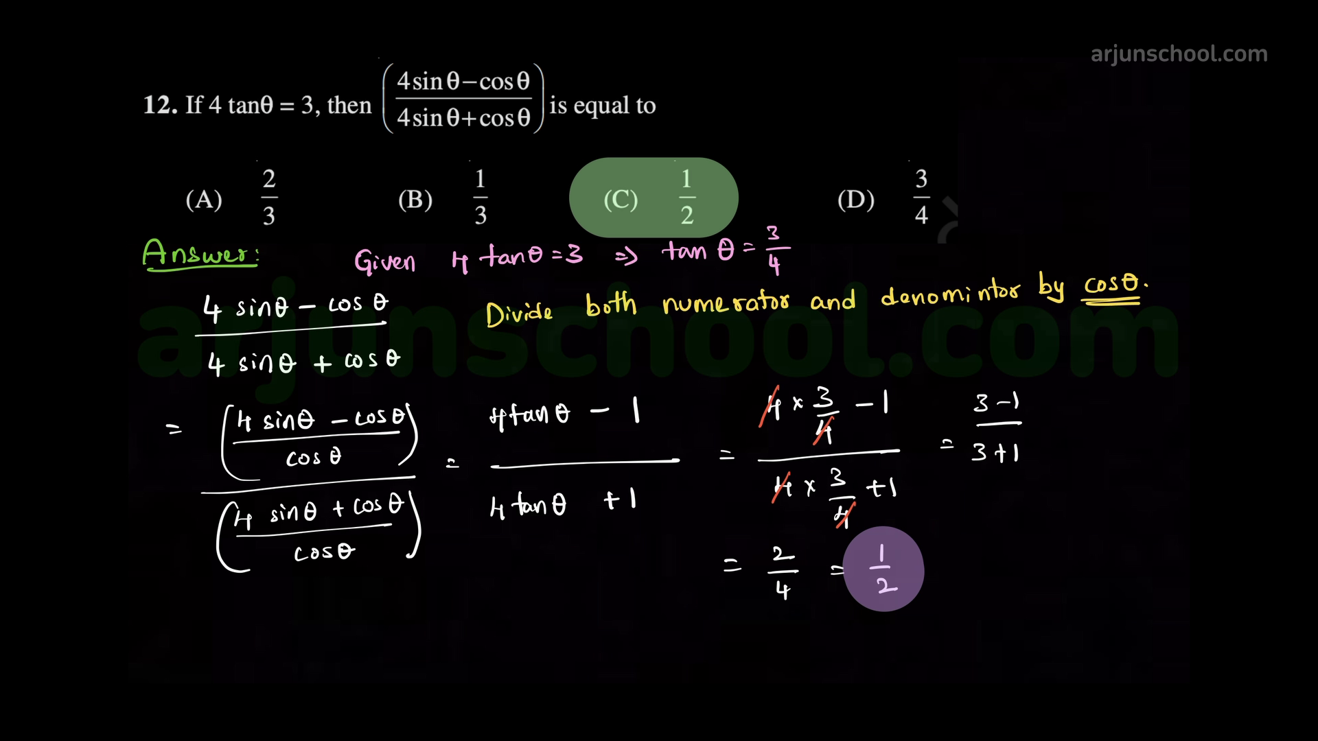 If \(4\tan\theta=3\), then \(\dfrac{4\sin\theta-\cos\theta}{4\sin\theta+\cos\theta}\) equals