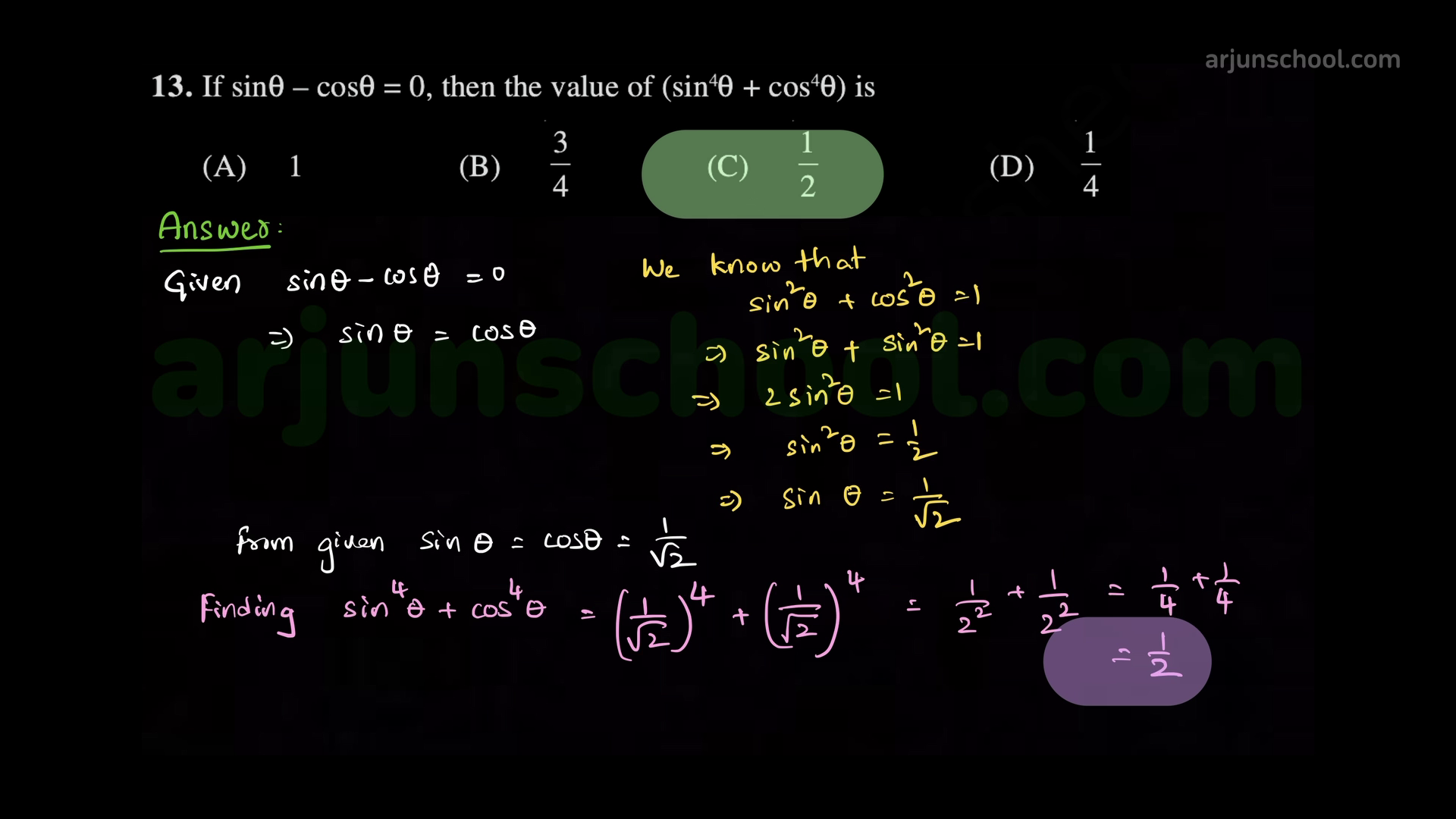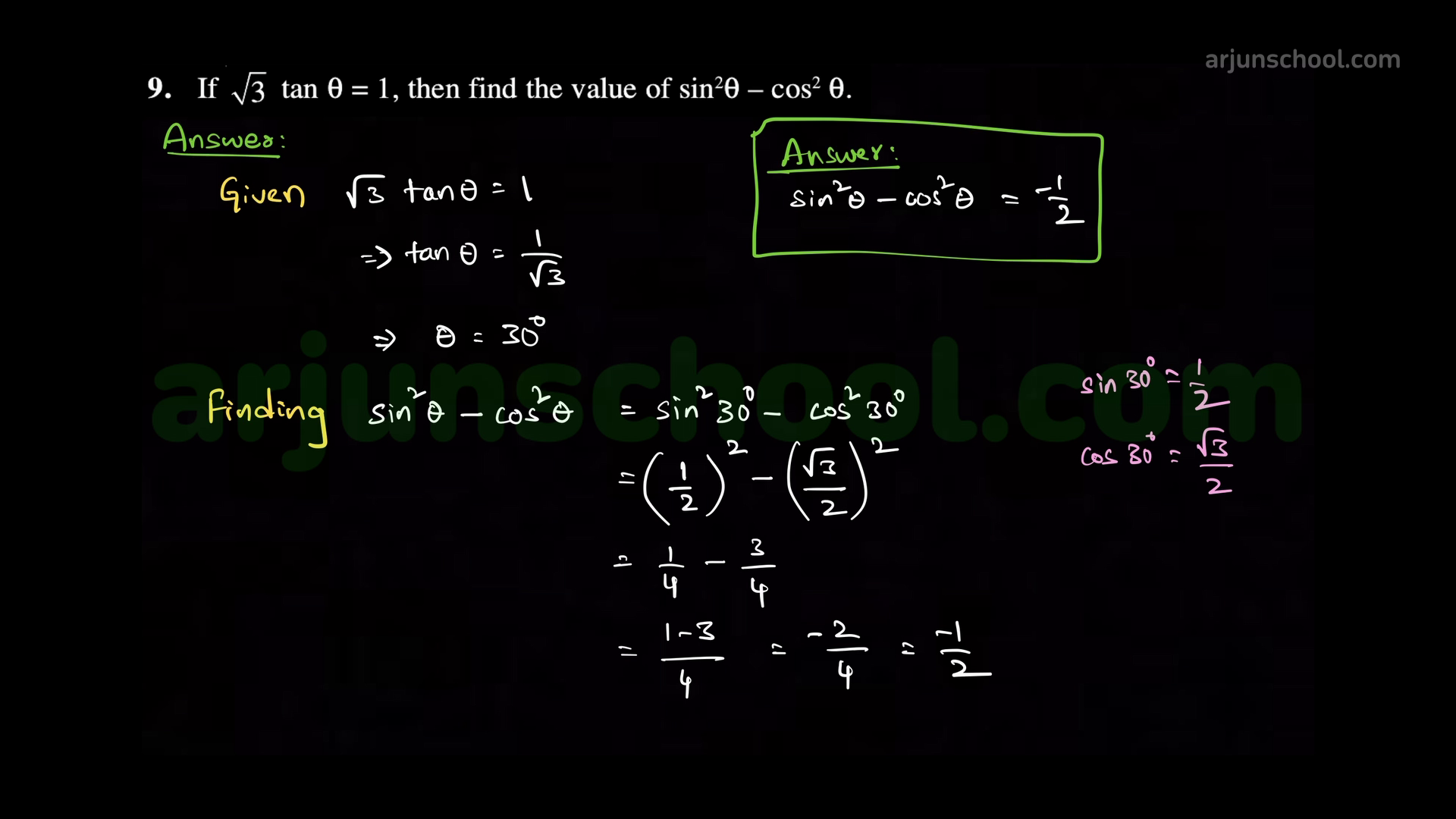 \(\displaystyle \sin^2\theta-\cos^2\theta=-\dfrac{1}{2}.\)