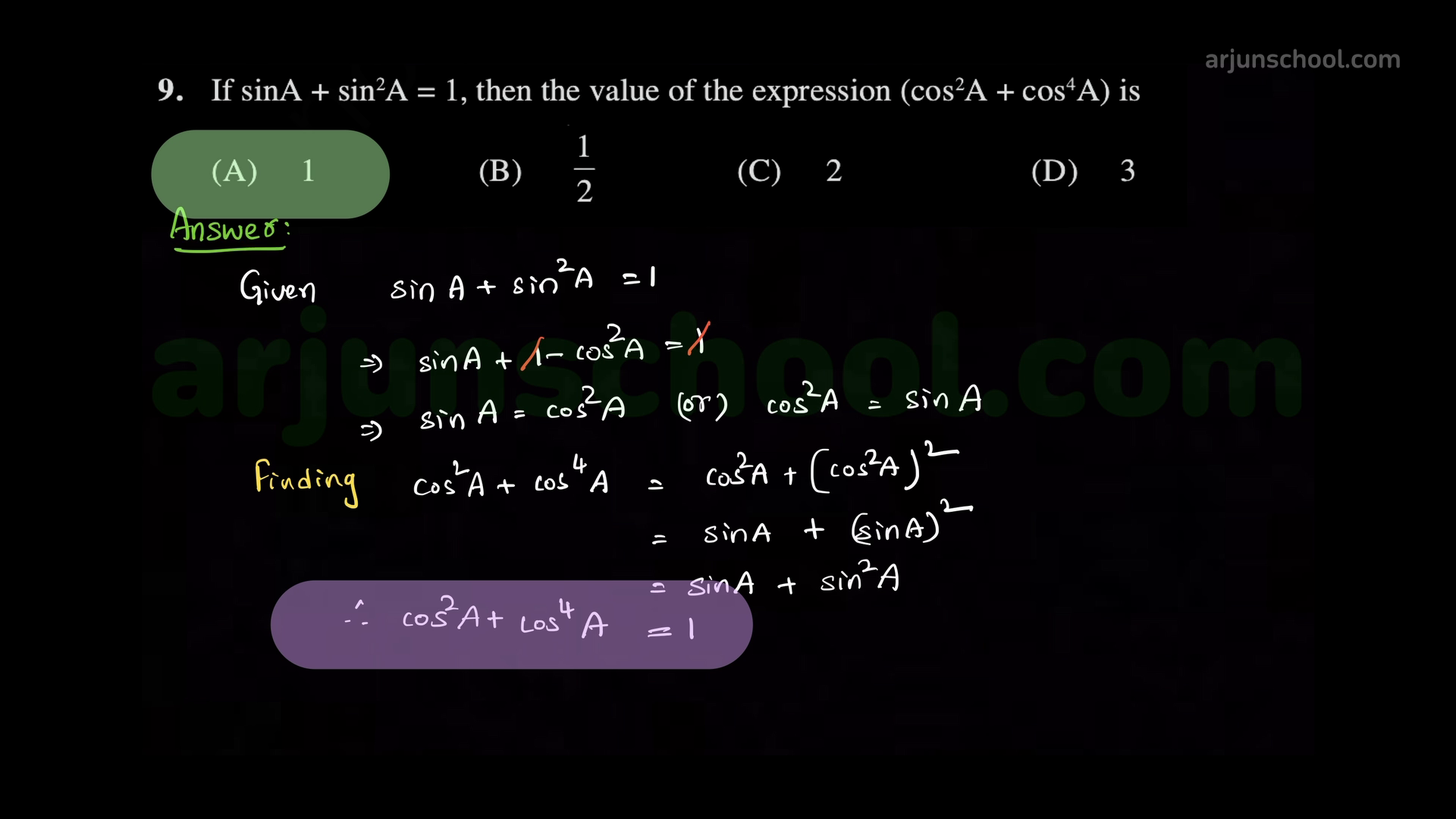 If \(\cos A+\cos^2A=1\), then \(\sin^2A+\sin^4A=1\).