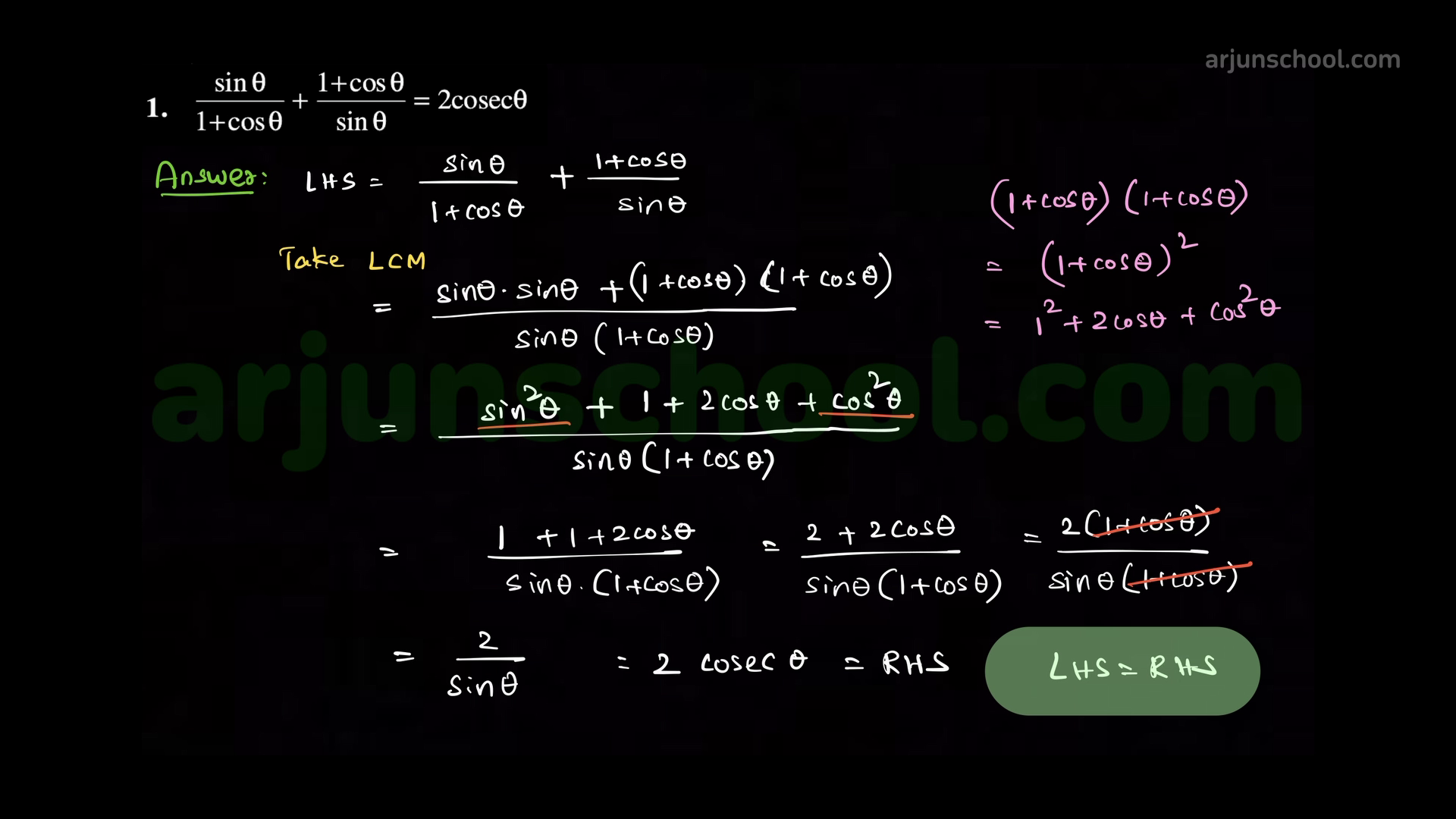 \(\displaystyle \dfrac{\sin\theta}{1+\cos\theta}+\dfrac{1+\cos\theta}{\sin\theta}=2\csc\theta\).