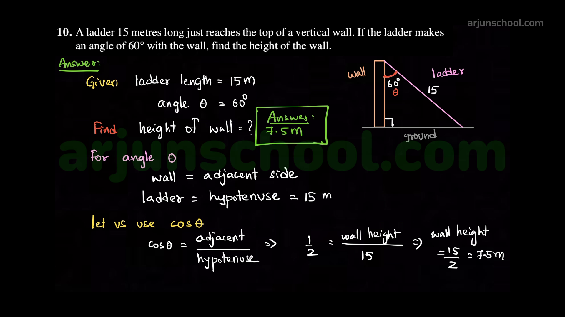 A \(15\) m long ladder just reaches the top of a vertical wall making an angle of \(60^\circ\) with the wall. Find the height of the wall.
