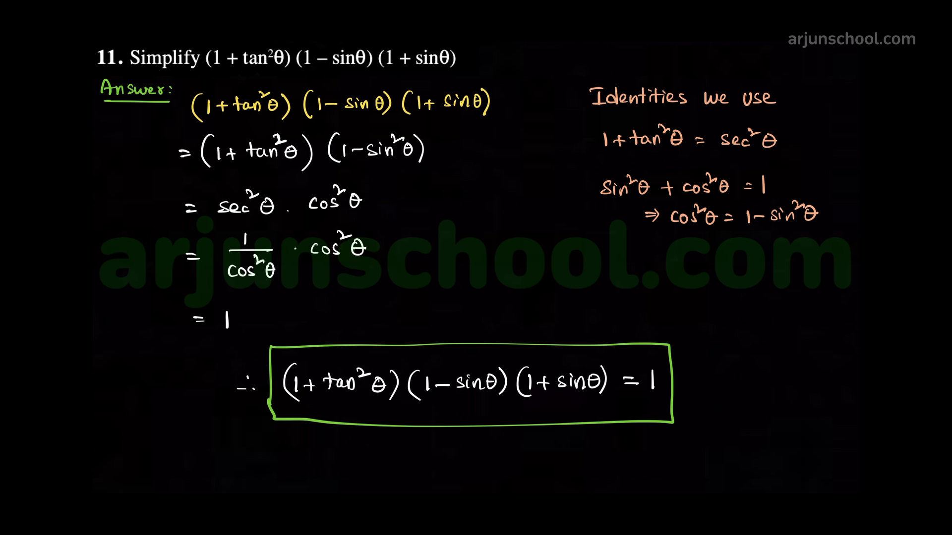 \(\displaystyle \sec^2\theta\,\cos^2\theta=1-\sin^2\theta=\cos^2\theta\) so the product equals \(1\).