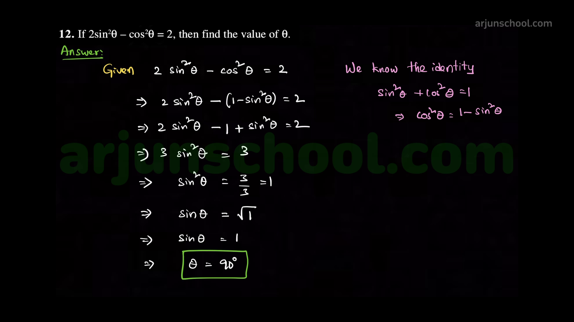 If \(2\sin^2\theta-\cos^2\theta=2\), find \(\theta\).