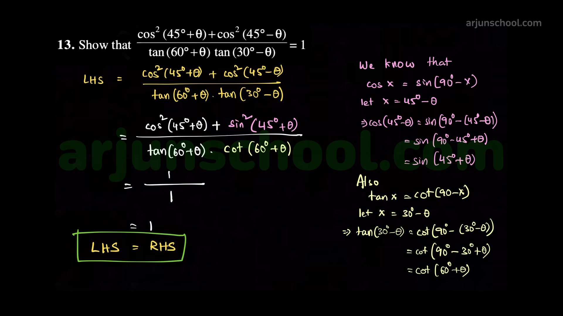 Prove that \(\dfrac{\cos^2(45^\circ+\theta)+\cos^2(45^\circ-\theta)}{\tan(60^\circ+\theta)\,\tan(30^\circ-\theta)}=1\).