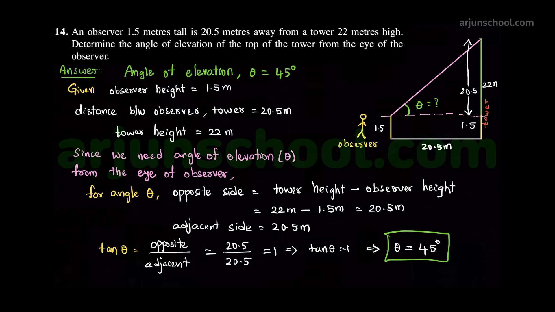 An observer \(1.5\) m tall is \(20.5\) m from a tower \(22\) m high. Find the angle of elevation of the top of the tower from the observer's eye.