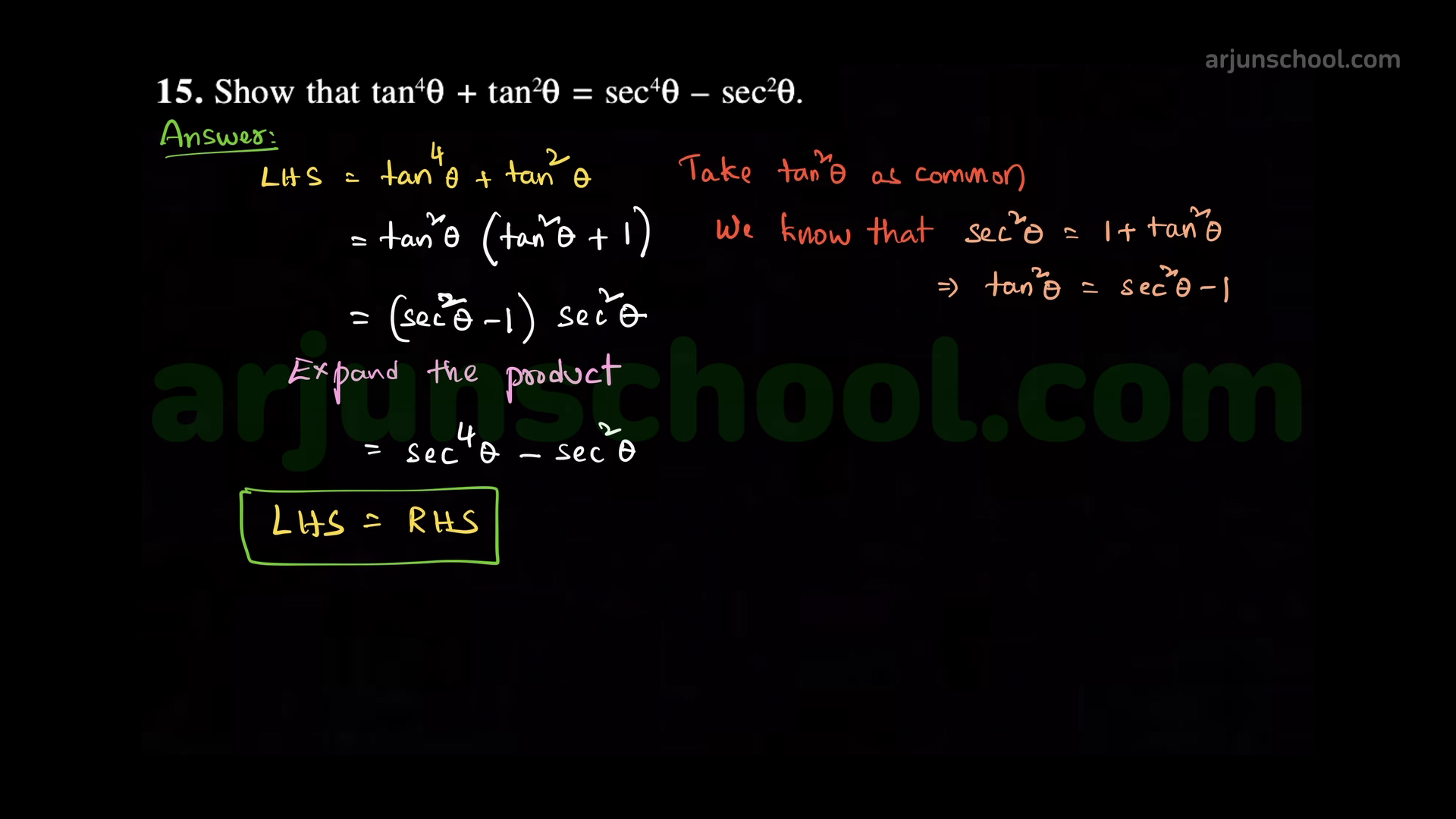 Prove that \(\tan^4\theta+\tan^2\theta=\sec^4\theta-\sec^2\theta\).