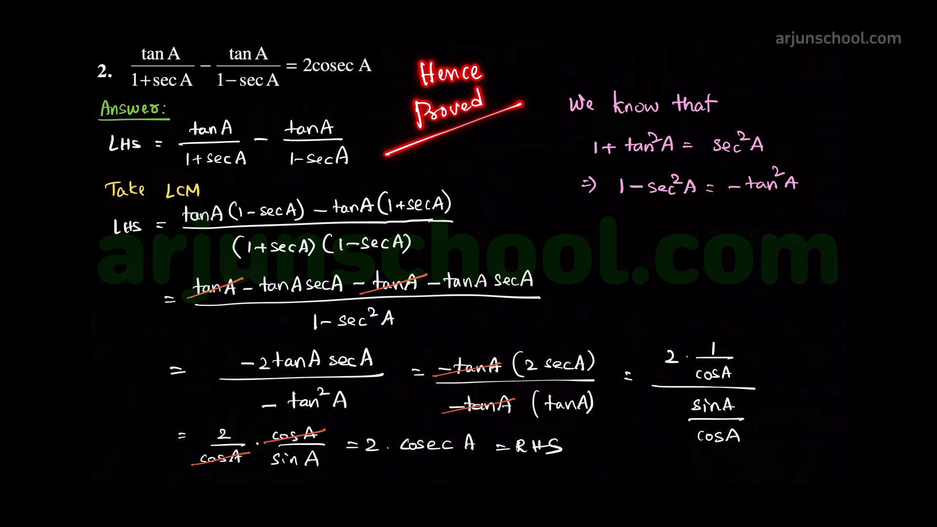 \(\displaystyle \dfrac{\tan A}{1+\sec A}-\dfrac{\tan A}{1-\sec A}=2\csc A\).