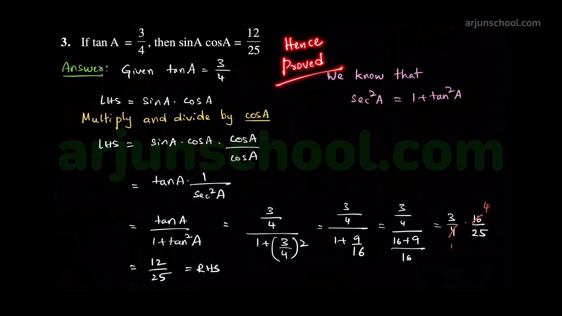 If \(\tan A=\dfrac{3}{4}\), prove that \(\sin A\cos A=\dfrac{12}{25}\).