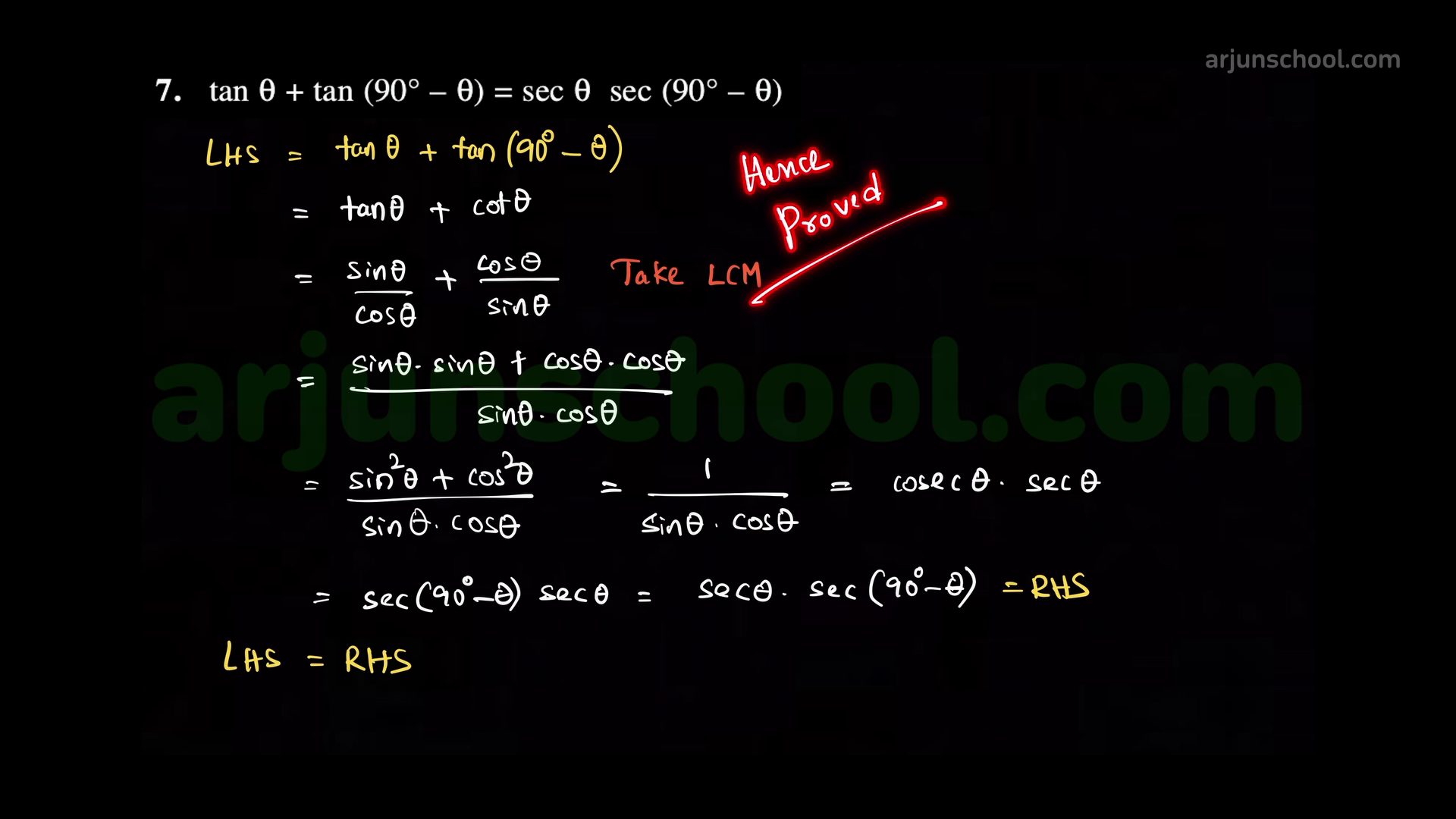 Prove that \(\tan\theta+\tan(90^\circ-\theta)=\sec\theta\,\sec(90^\circ-\theta)\).