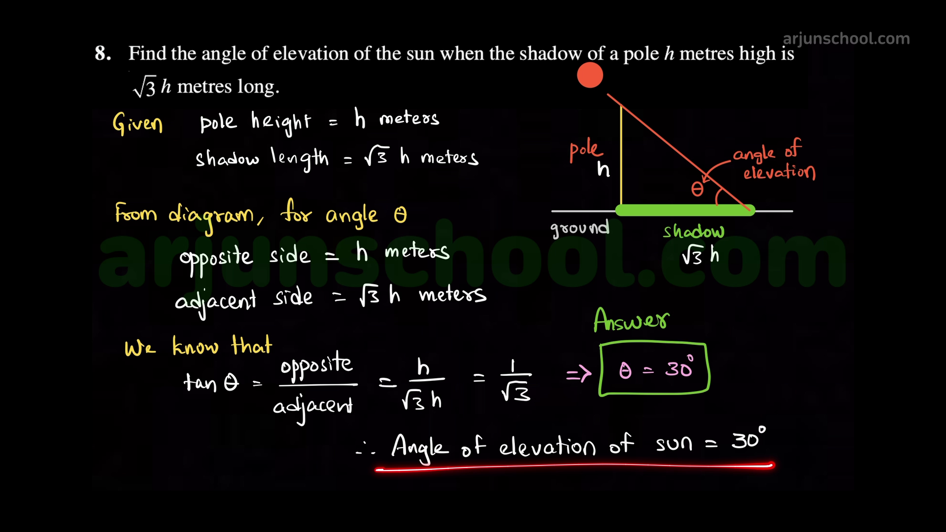 The shadow of a pole of height \(h\) metres is \(\sqrt{3}\,h\) metres long. Find the angle of elevation of the Sun.
